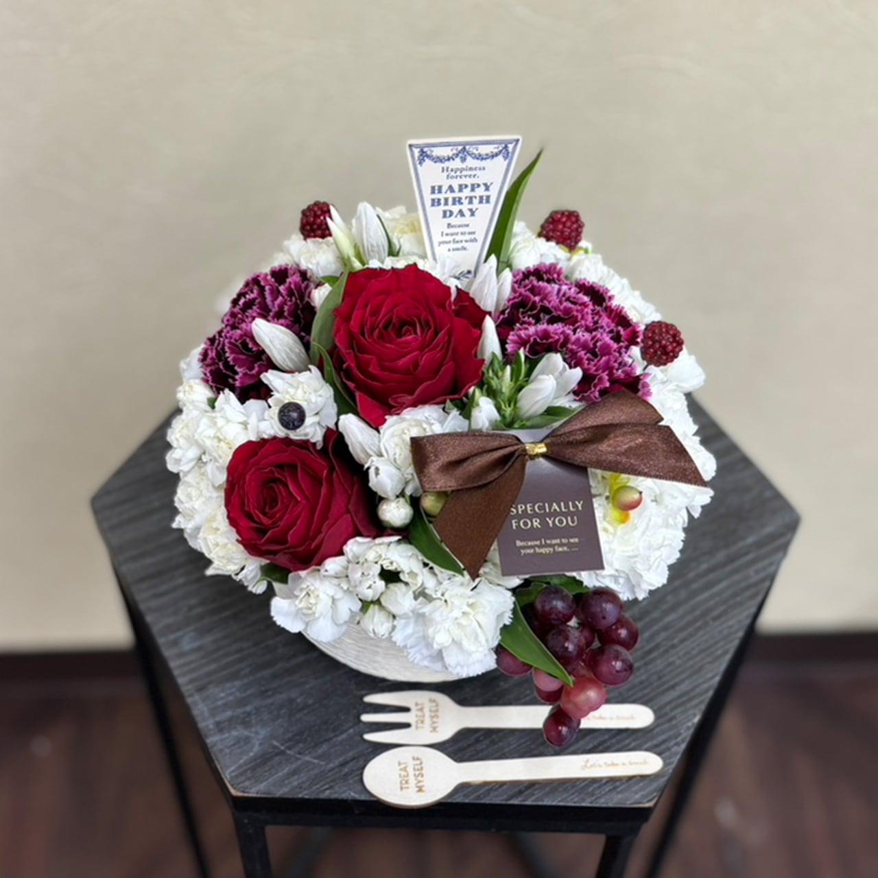 真っ白なカーネーションでまるでホイップクリームのような土台を作り、リボンやピック、フェイクフルーツの装飾でまるでスイーツのような可愛らしさと遊び心を演出しています。