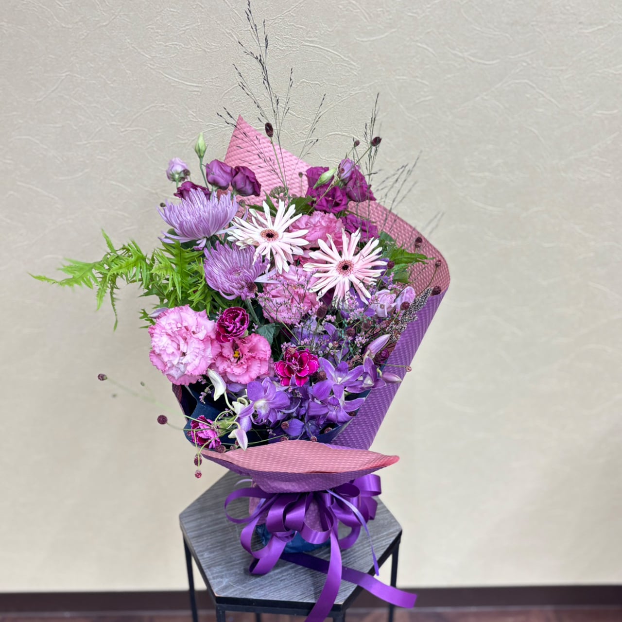やわらかいピンク、淡い紫、深い紫…それぞれの花が絶妙なバランスで溶け合い、落ち着いた中にも華やかさを感じる仕上がりです。