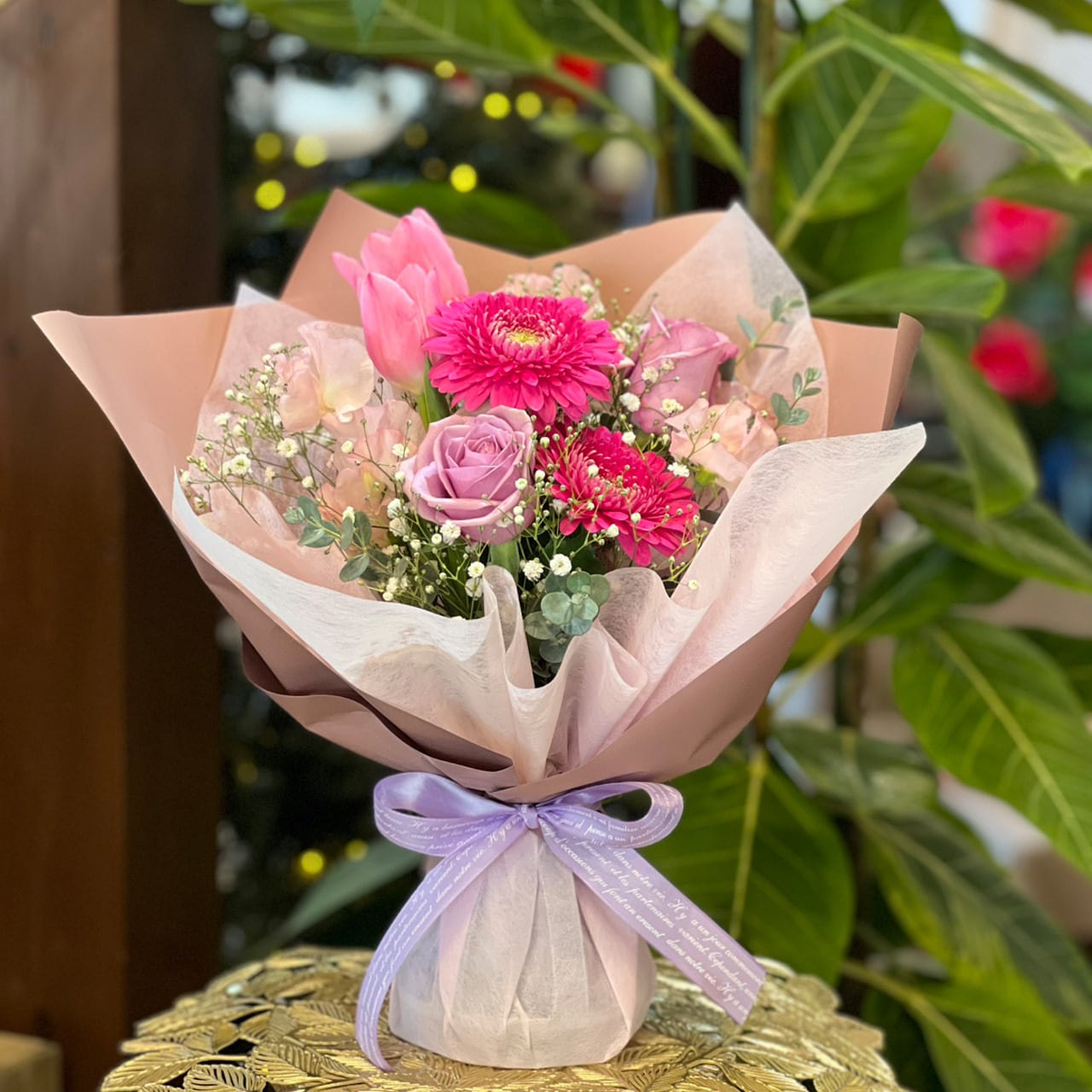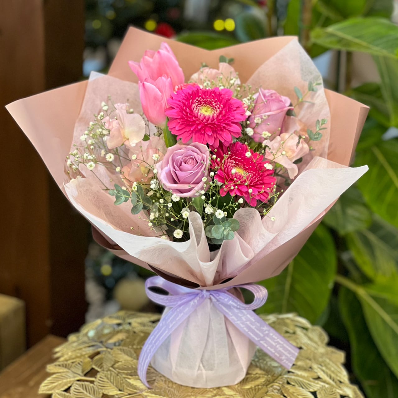 淡いラベンダーやスイートピー、チューリップ、ガーベラなど、春の花たちをたっぷり使った可愛らしいピンク系のおくだけブーケ。濃淡のピンクにラベンダー色を合わせ、上品さと可愛らしさを絶妙に両立させました。やわらかな色合いで、玄関・リビング・オフィスなど、どんな場所にも優しく馴染みます。ラッピングにも淡いトーンのラベンダーリボンを使い、春の訪れを感じさせるギフトにぴったりな一品です。