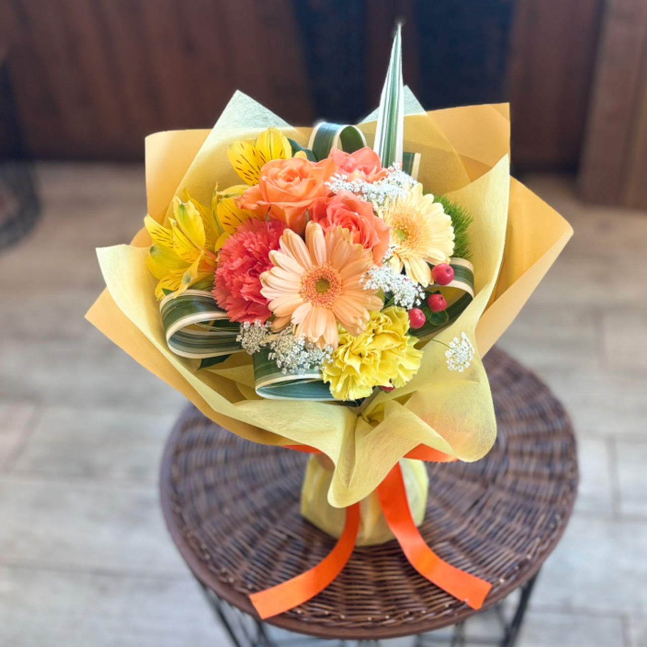 黄色とオレンジの春色をぎゅっと束ねた、元気とやさしさを届けるSSサイズのブーケです。明るいアルストロメリアやカーネーション、ふんわりとしたホワイトレースが、軽やかで爽やかな印象に。ナチュラルなラッピングとリボンが可愛らしさを引き立て、気軽に飾れるサイズ感も魅力です。