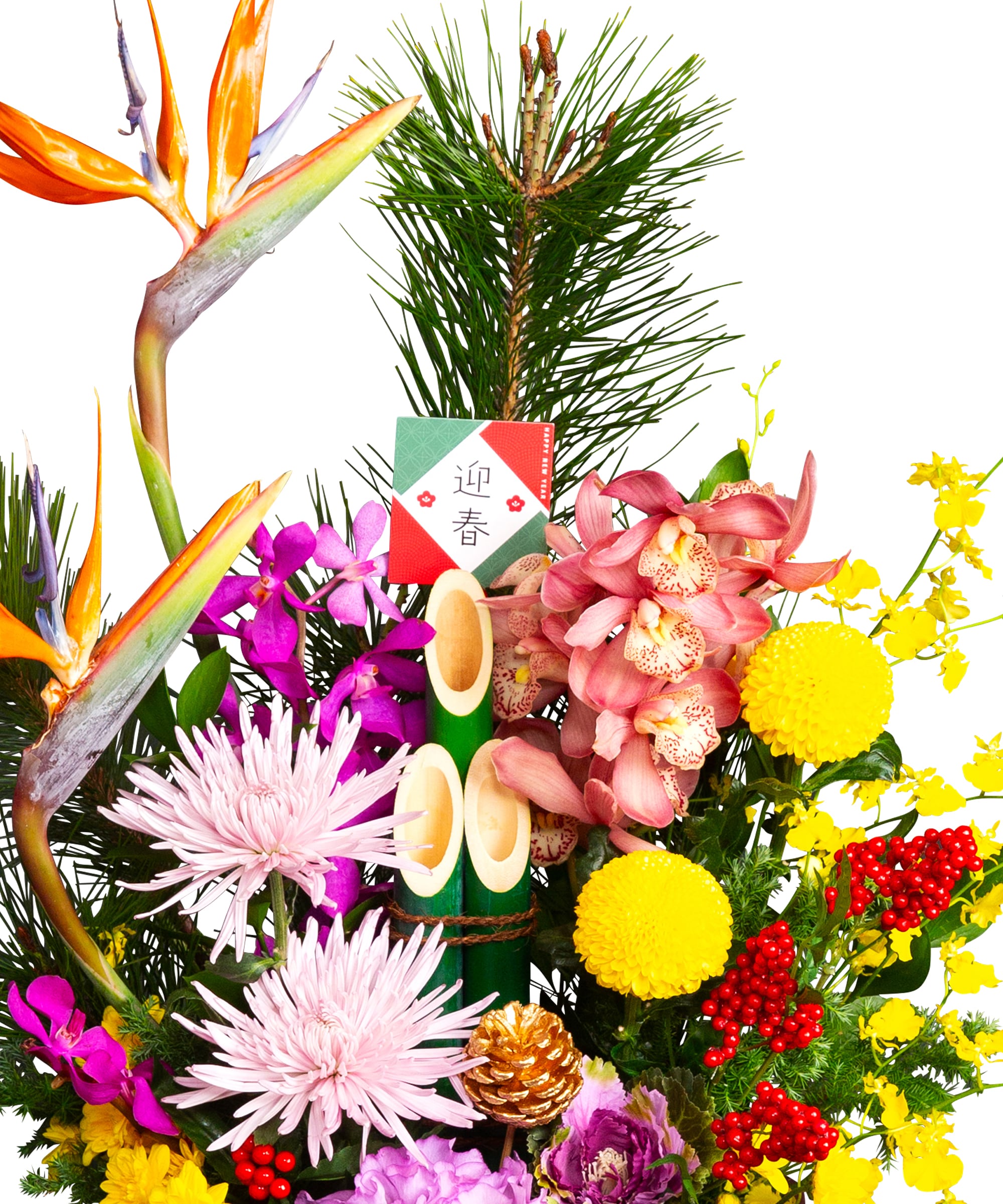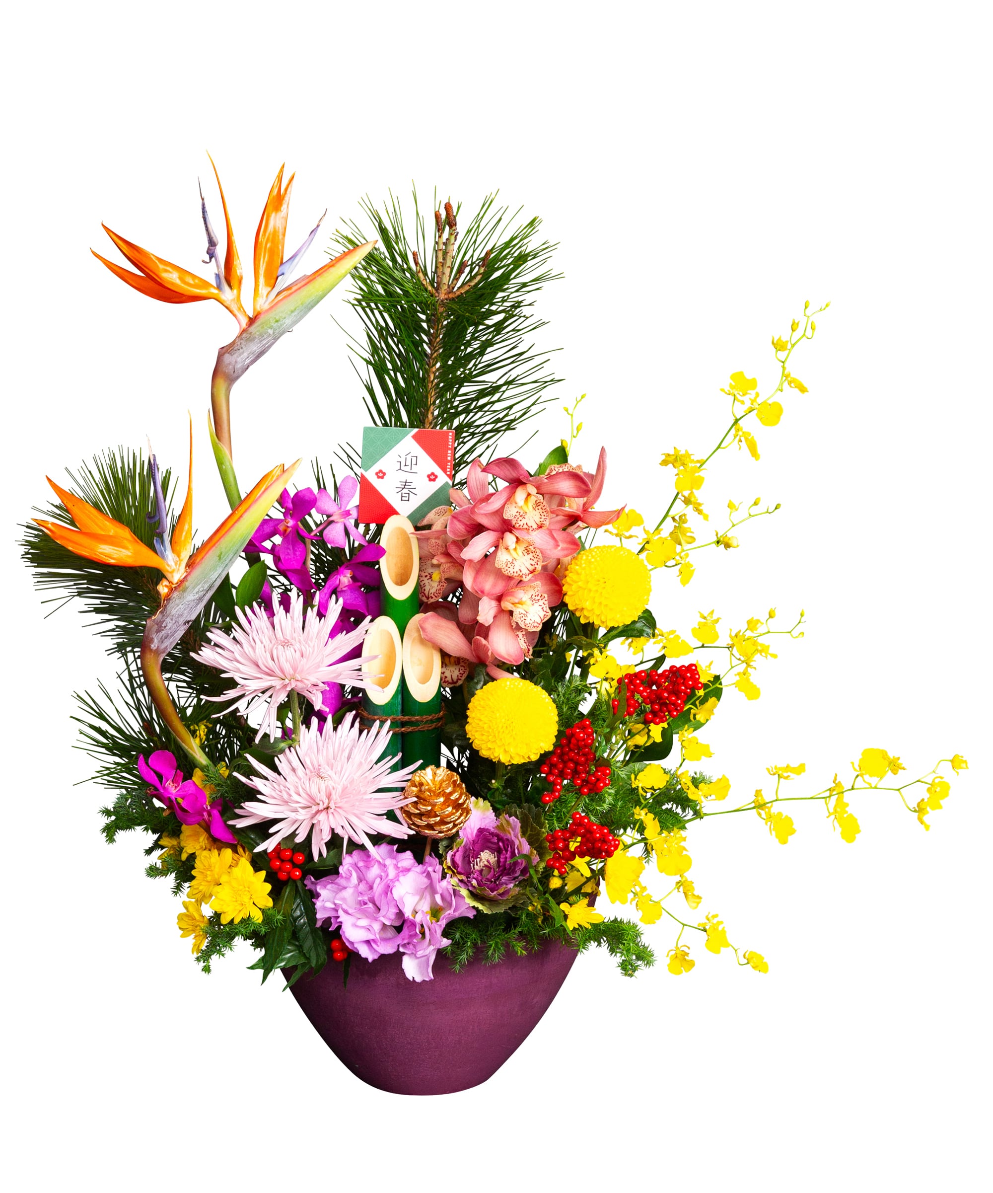 【使用花材】ストレリチア、松、シンビジウム、オンシジューム、マムほか